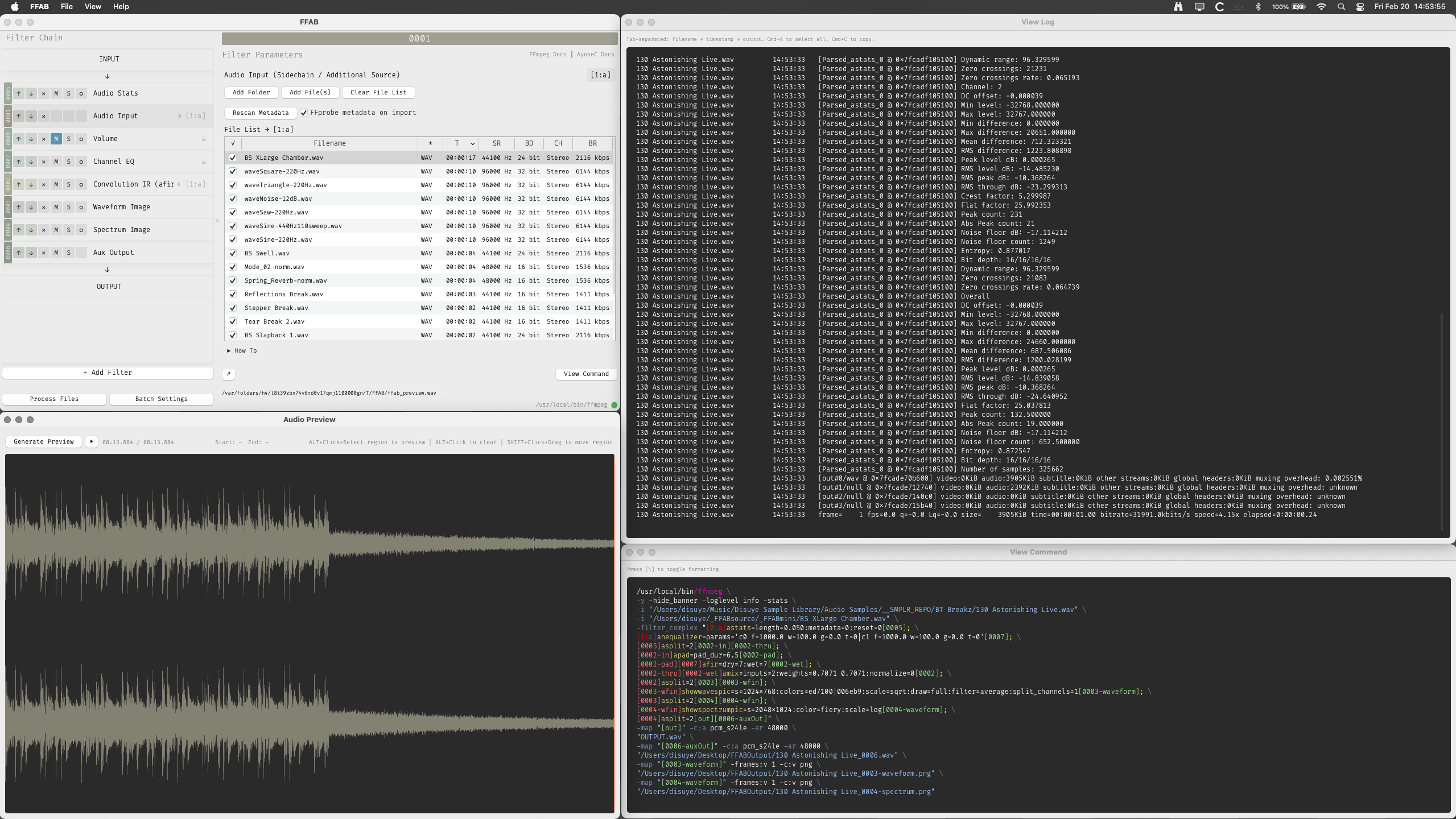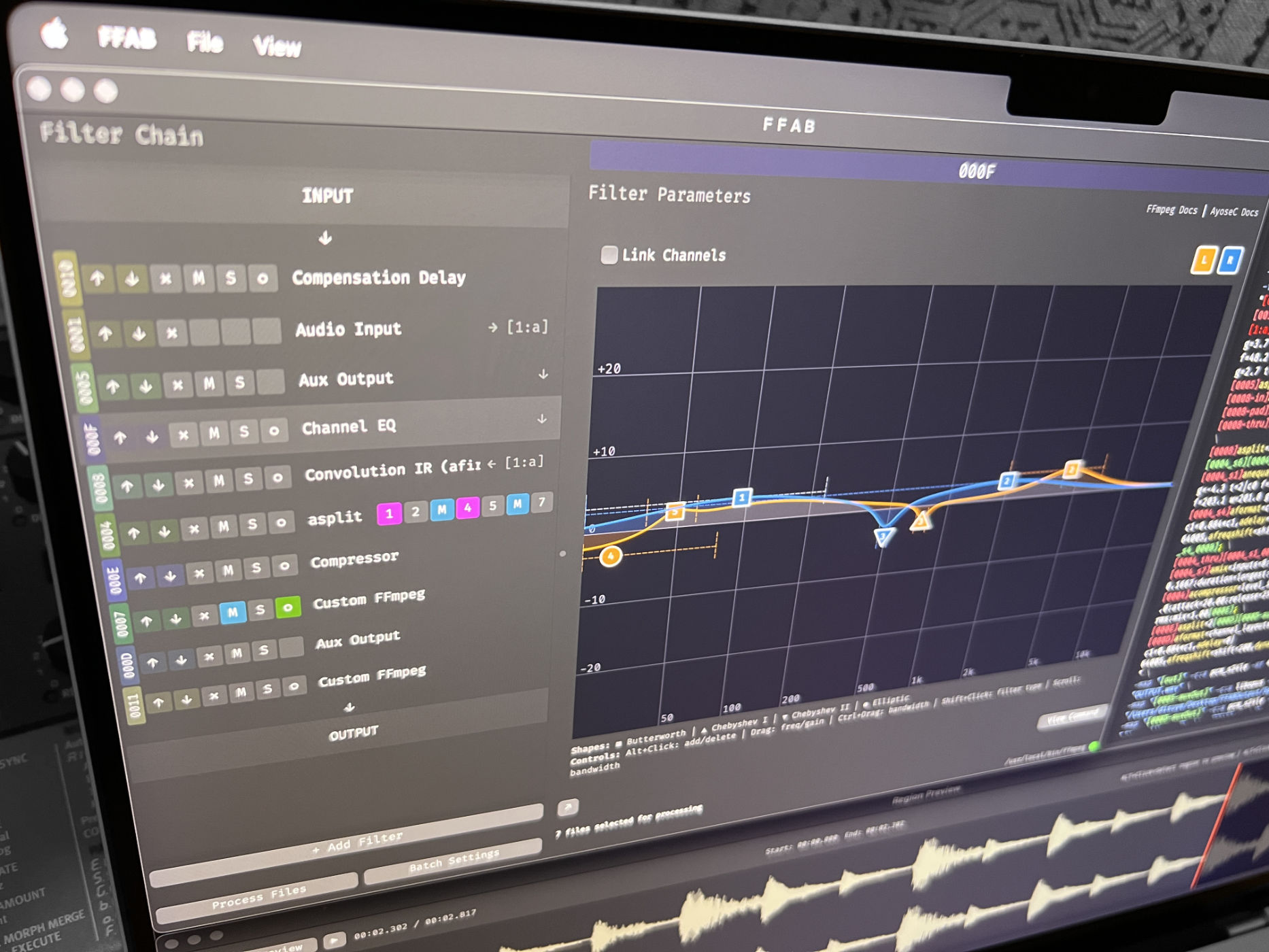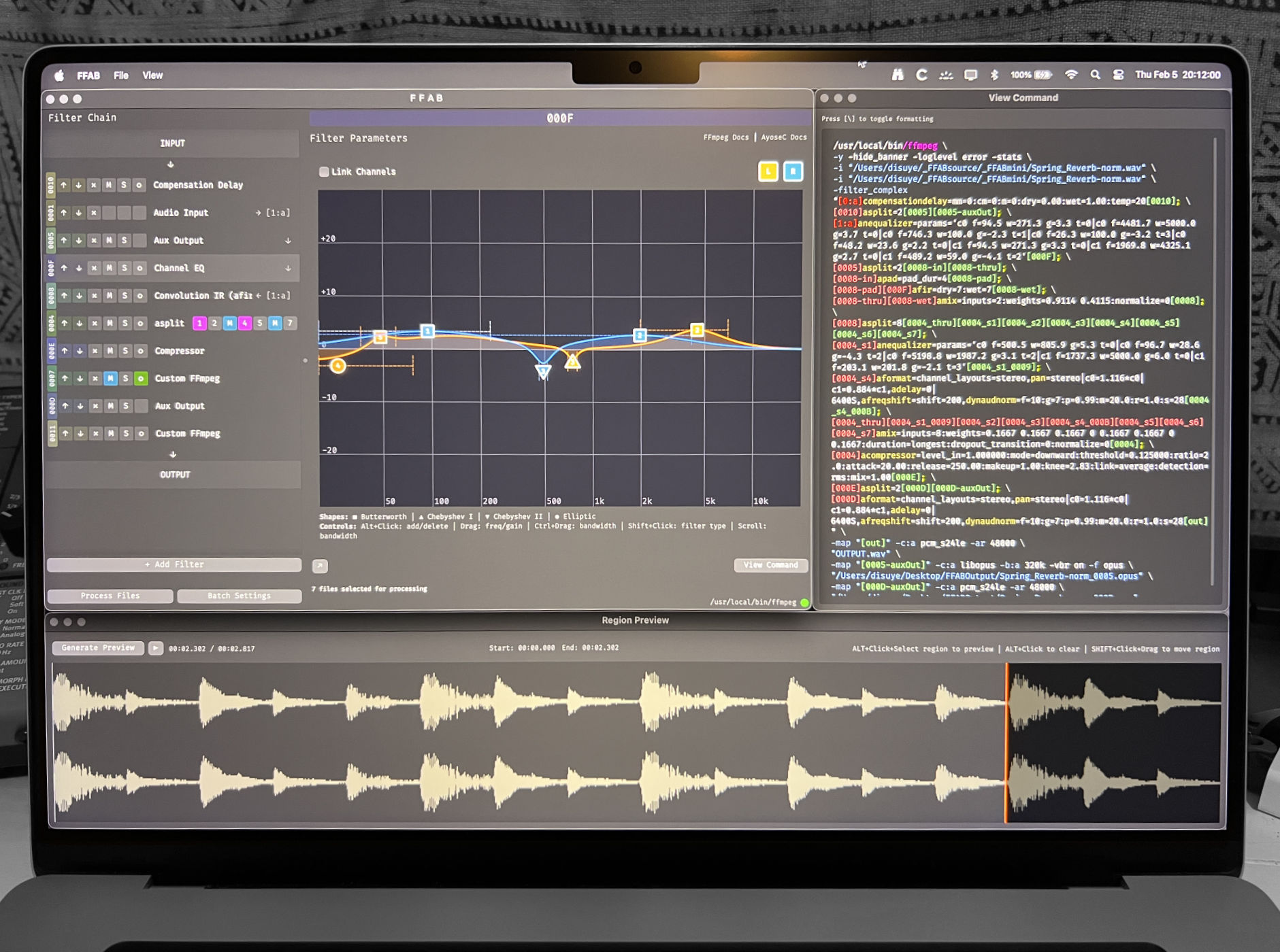 FFAB is a cross-platform, complex audio batch processor, effects rack, command builder & graphical user interface for the glorious FFmpeg.