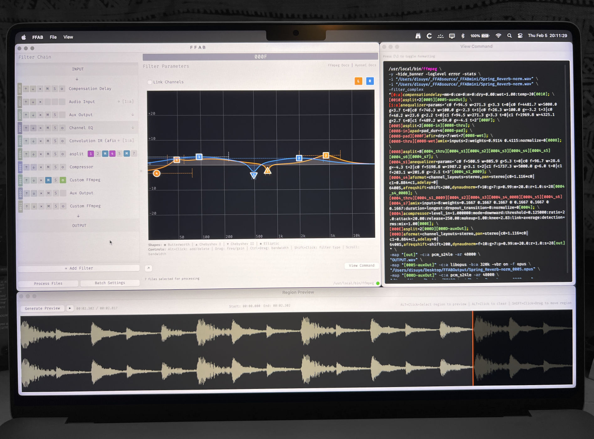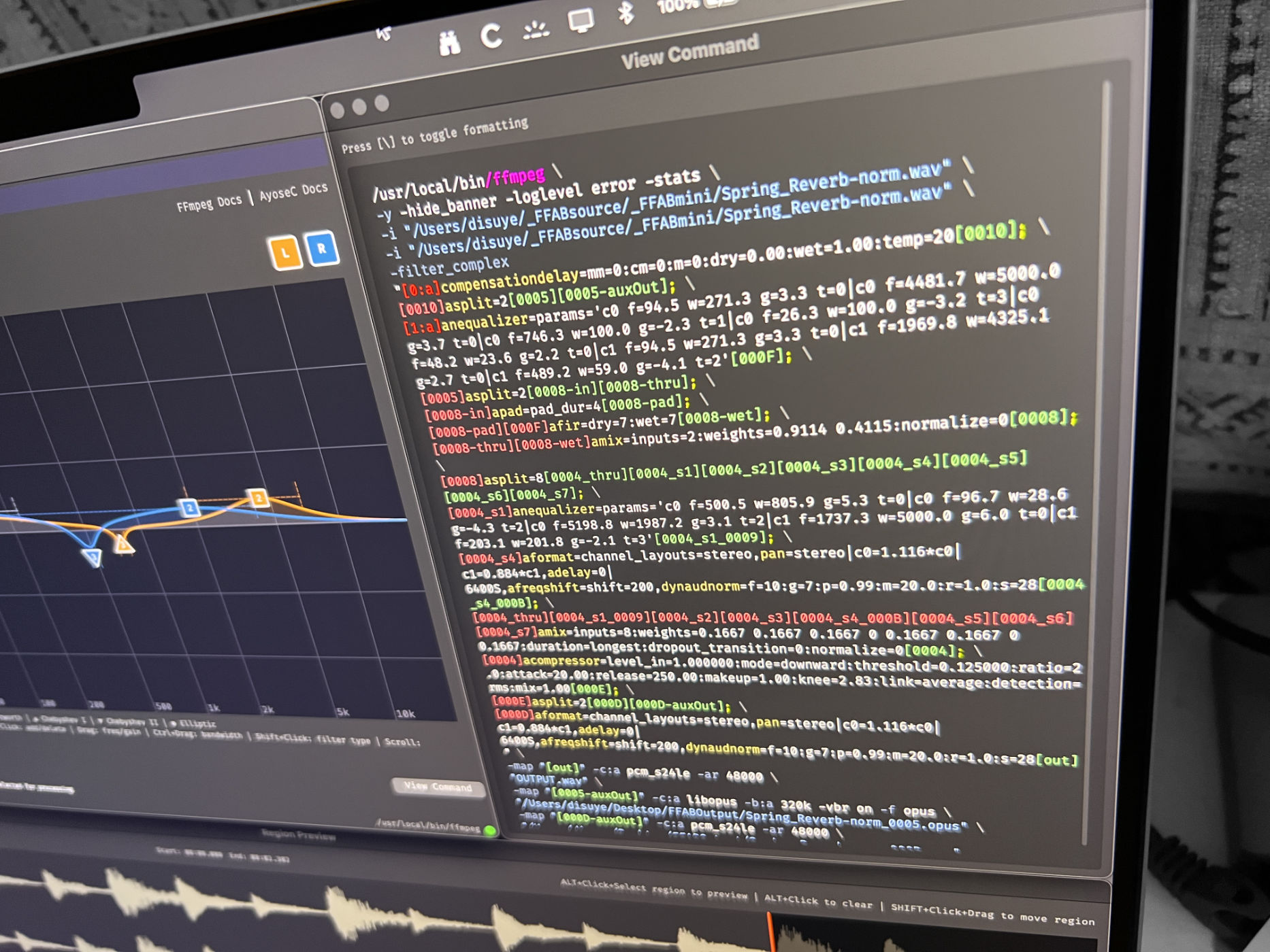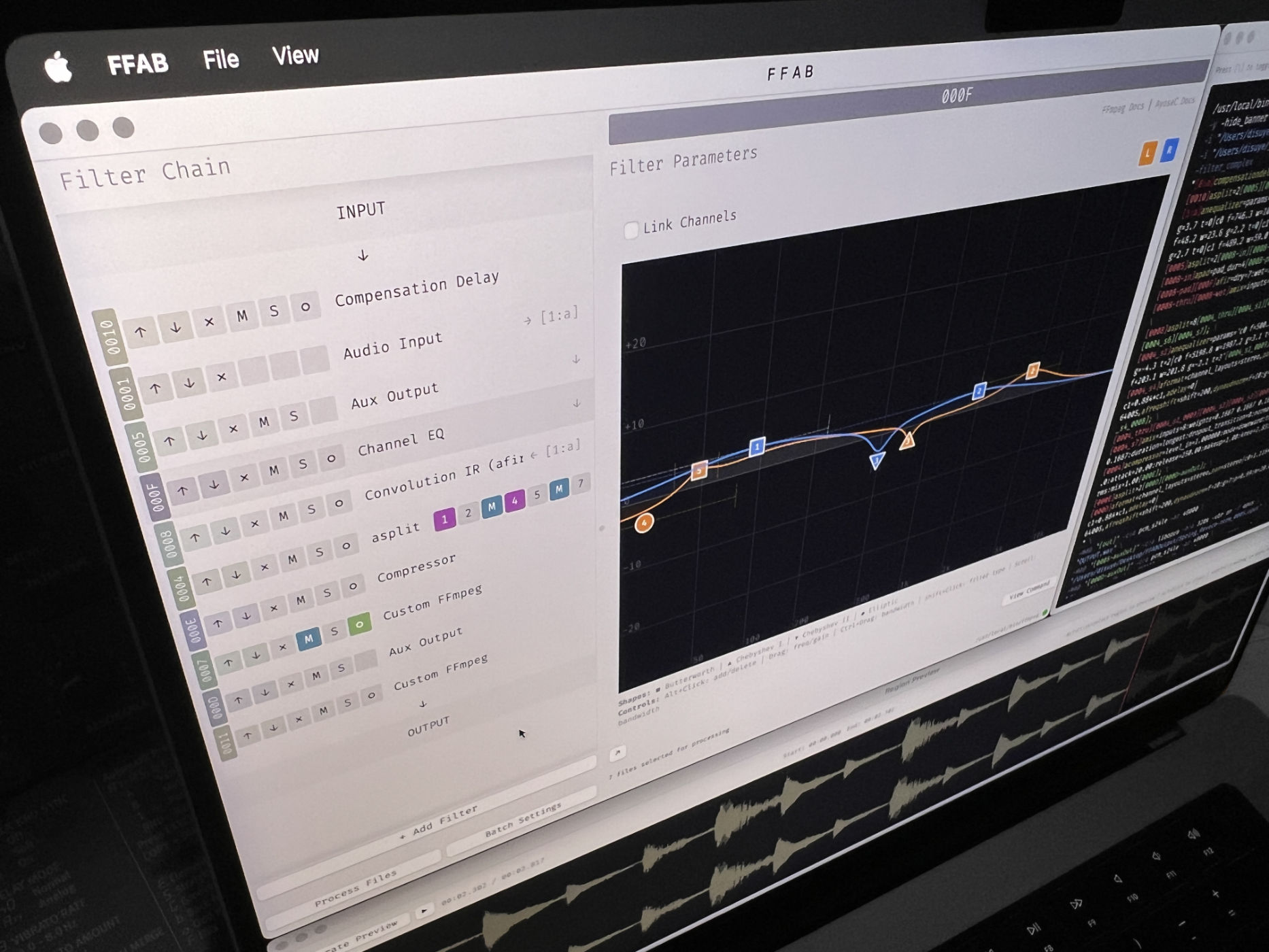 FFAB is a cross-platform, complex audio batch processor, effects rack, command builder & graphical user interface for the glorious FFmpeg.